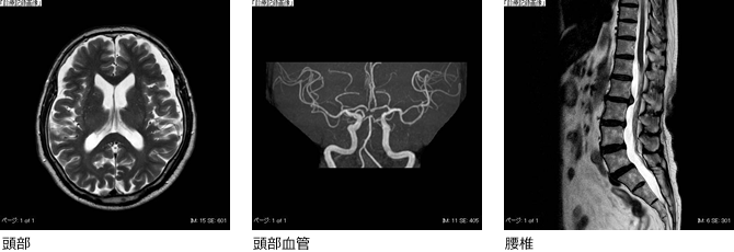 - MRI検査は、X線CT装置などと異なり放射線を使用しないため人体への影響がなく、人体のあらゆる方向の断面の画像を得ることができます。また、1.5T(テスラ)の高磁場磁石により、精度の高い検査をおこなうことができます。頭部、腹部、脊椎はもとより、血管、四肢などの検査も可能で、最先端の画像診断装置として活躍しています。